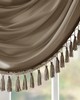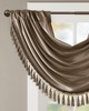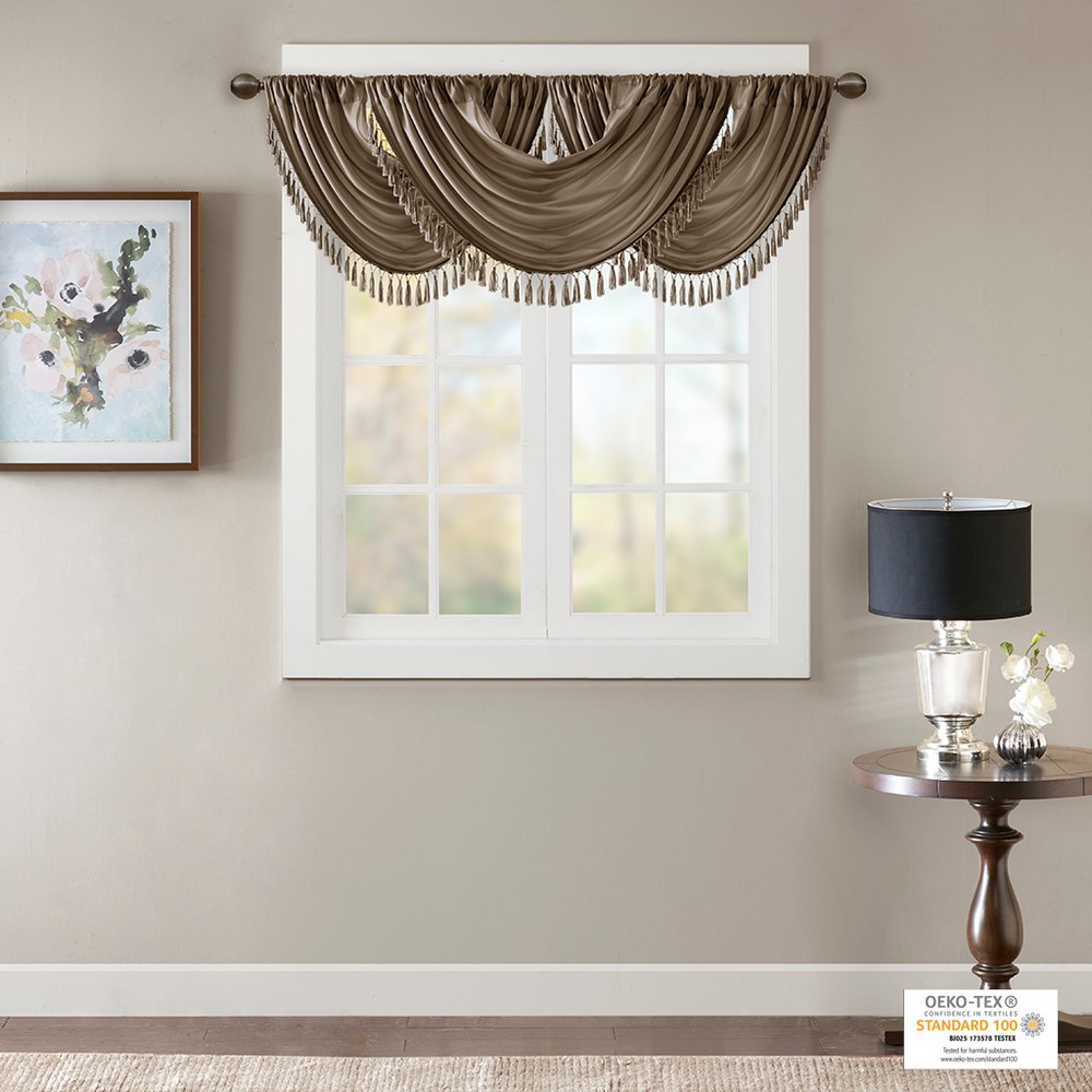 | Madison Park 38x46" 1 Window Valance: 38"W x 46"L Faux Silk; 100% Polyester Traditional Style Includes 1 Piece(s) Machine Washable Bring style and sophistication to your windows, with our Elena Waterfall window valance. This classy bronze valance showcases rich center draping details and a beautiful tassel trim, combined with the faux silk fabric for a rich sheen and stylish update. Features added lining and a rod pocket top finish; fits up to 1.25" diameter rod. Part of our decorative valance collection, this valance is perfect as a stylish addition to any small window or even better as a layering piece to dress up any window panel. This window valance is also OEKO-TEX certified, meaning it does not contain any harmful substances or chemicals, ensuring quality comfort and wellness. Need to purchase 3 valances to create same look as image. |