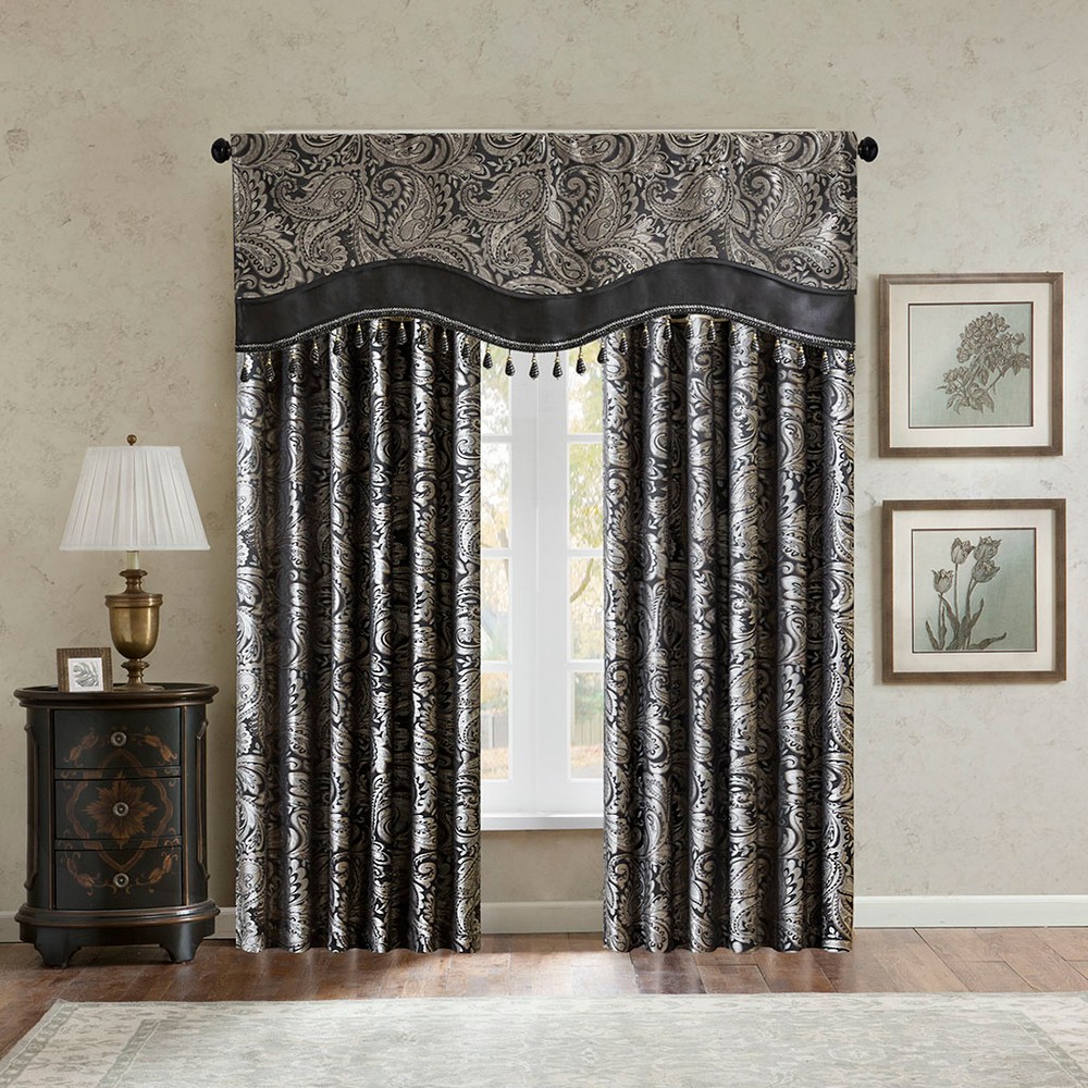 | Madison Park 50x18" 1 Window Valance: 50"W x 18"L Face:100% Polyester Jacquard, Lining: 100% polyester, Trims: gold beads; Traditional Style Includes 1 Piece(s) Machine Washable For a unique and luxuriously classic style, our Madison Park Aubrey Beaded Valance is the perfect extra touch to your decor. The alluring jacquard weave is inspired from an updated paisley motif and is woven in beautiful hues of black, gold, and a hint of silver for a shimmering accent. The window valance features solid faux silk piecing and flat piping details, while delicately finished with a scalloped bottom design and intricate gold bead trim, creating an intriguing elegant look. This window panel is also OEKO-TEX certified, meaning it does not contain any harmful substances or chemicals, ensuring quality comfort and wellness. Simply hang on rod pocket; fits up to a 1.25 diameter rod. |