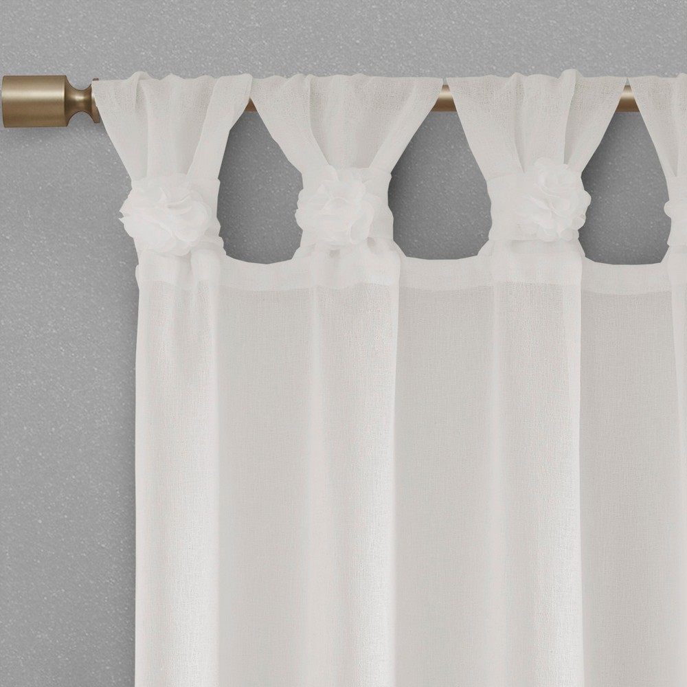| Madison Park 50x63" 1 Window Panel: 50"W x 63"L Faux Linen Sheer Vintage/Shabby Chic Style Includes 1 Piece(s) Machine Washable Simple and feminine in all the right ways, Madison Park Rosette Tab Top Solid Window Panel Embellished with Flower offers a gorgeous one-of-a-kind look to your home. This solid white panel features a tab top finish and beautiful removable floral pins that give your room a decorator’s touch. The lightweight faux linen semi-sheer fabric filters the perfect amount of light into your home, while creating a soft airy feel - for the perfect shabby chic update to your decor. Window panel is machine washable for easy care, while floral pins are spot clean only. Fits up to a 2" diameter rod. |