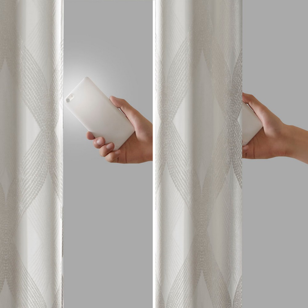 Combining luxe style with functionality, our SunSmart Bentley Ogee Knitted Jacquard Total Blackout Panel is the perfect update to dress any window. An ogee knitted jacquard design is featured in a rich ivory hue, creating a luxurious sheen and texture. The heavy fabric uses a foamback and bonding finish enhancing the panel to block out all sunlight, provide a maximum protective barrier against noise intrusion, and offer a maximum level of privacy and energy savings. A silver grommet top finish makes it easy to hang, open, and close panels throughout the day; fits up to a 1.25” diameter rod. With 100% total blackout properties, this window panel is the perfect addition for bedrooms, media rooms, or any private spaces, giving your home a lavish and contemporary appeal. Lighting level: Pitch Black Ambiance.