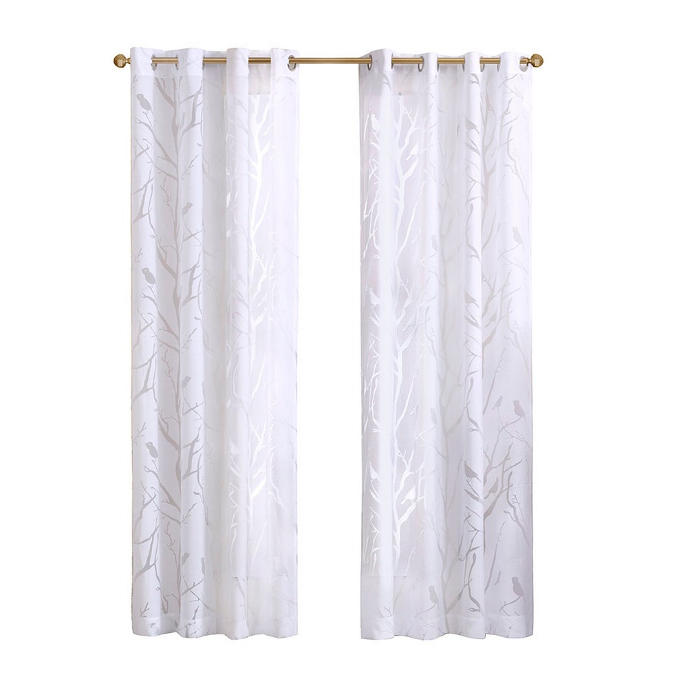 Averil White Grommet Top Sheer Bird on Branches Burnout Window Curtain