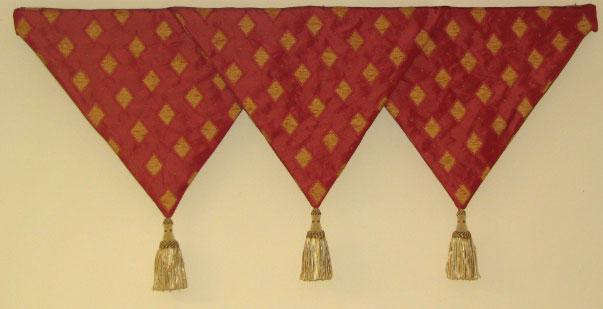 | Bandana Valance is board mounted. This valance is more suitable for medium and upholstery weight fabrics. Optional tassels give it a whimsical look. Call 1-800-590-5844 or email us for more information or ordering. |