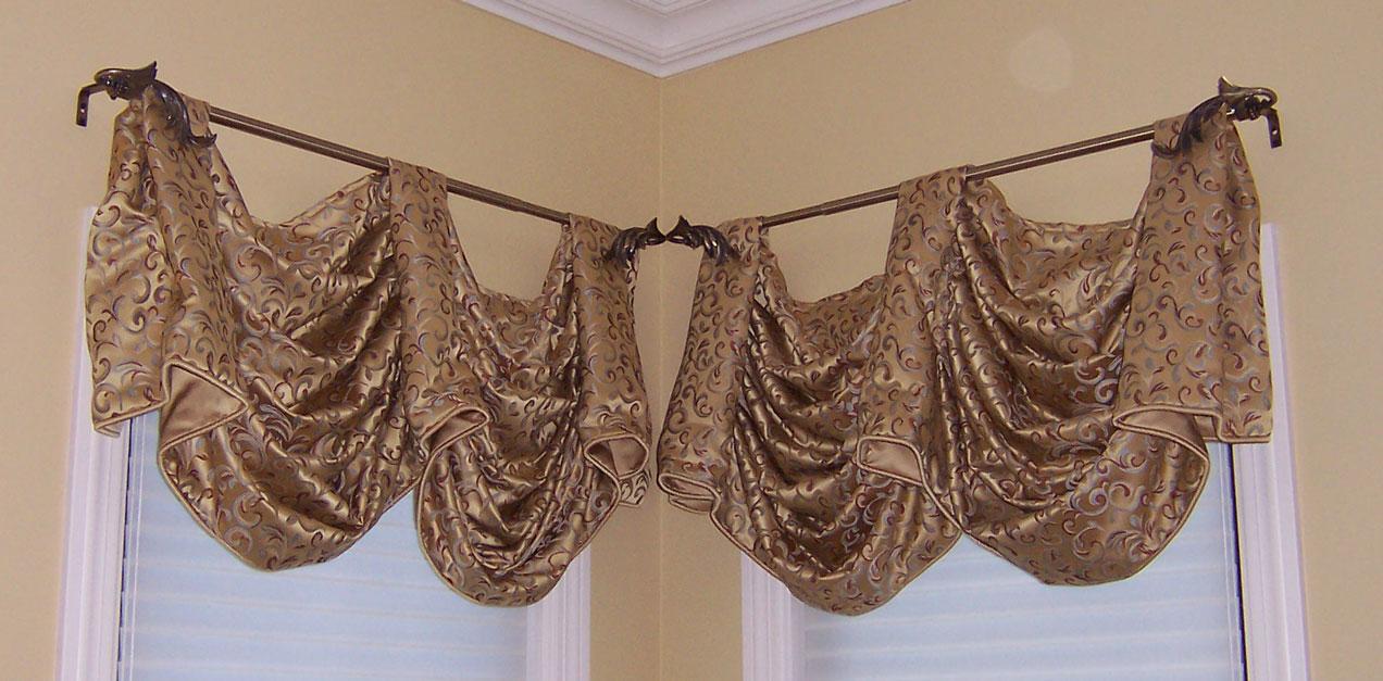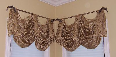 | A custom empire pole swag valance has always been a classic favorite in many homes for many generations. It's a beautiful valance with luscious volume due to the generously pleated swags. A drapery pole up to 1 3/4 inches in diameter is recommended for the empire swag valance. Call 1-800-590-5844 or email us for more information or ordering. |