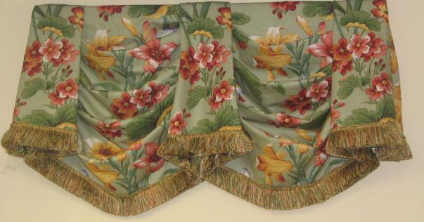 | Create this graceful board mounted valance with medium weight fabrics. Shown with optional trim. Call 1-800-590-5844 or email us for more information or ordering. |