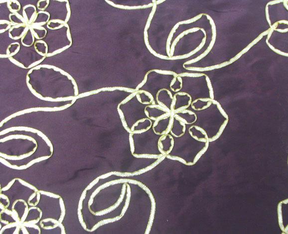 Lovely purple faux silk with a gold ribbon embroidery floral pattern. Discontinued fabric.