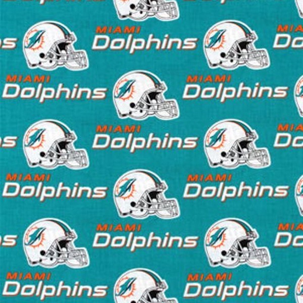 Cotton print fabric adorning the team colors and logo of the Miami Dolphins.