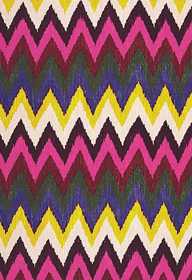 Inspired by an antique warp printed silk textile discovered by Martyn during his travels, this fabric combines the brilliance of clear colorations with the boldness of a chevron pattern. Printed on a tightly woven cotton poplin ground suitable for upholstery and curtains, the smooth surface of the fabric and textured interpretation of the design echo the original silk ikat. The graphic look of Adras Ikat Print is perfect for adding an exotic note to a traditional room or a pop of saturated color in a modern interior.