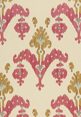 The classic motifs of a traditional antique Central Asian silk ikat textile inspired this dramatic embroidery design. Silky viscose threads in shimmering hues that range from jewel-like brights to metal-inspired neutrals are overstitched in varying yarn shades and closely resemble the look of the hand-woven original. Its soft, neutral linen twill grounds add a natural backdrop to the boldness of this exotic pattern. The scale is designed to work perfectly on seat cushions and curtain panels alike. |