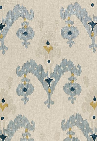 The classic motifs of a traditional antique Central Asian silk ikat textile inspired this dramatic embroidery design. Silky viscose threads in shimmering hues that range from jewel-like brights to metal-inspired neutrals are overstitched in varying yarn shades and closely resemble the look of the hand-woven original. Its soft, neutral linen twill grounds add a natural backdrop to the boldness of this exotic pattern. The scale is designed to work perfectly on seat cushions and curtain panels alike. |