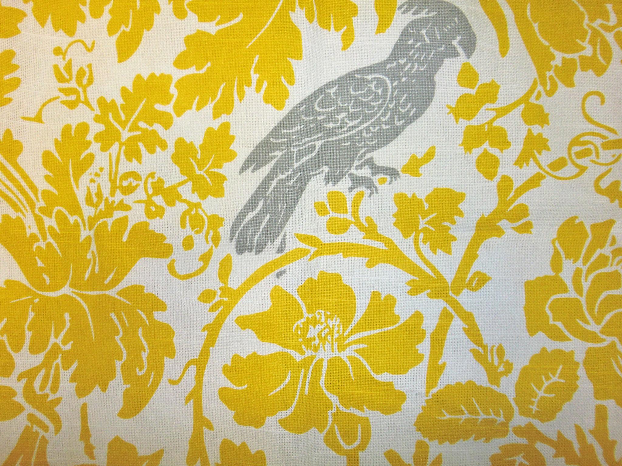 | Trendy yellow and white fabric with an ash grey bird. |