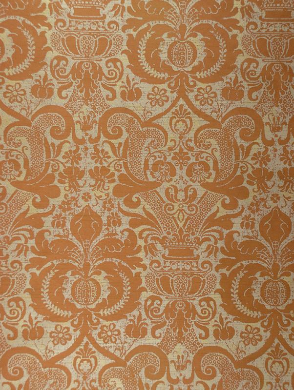 | Wesco Fabrics Fabulous faux silk drapery fabric with a wonderful dark orange sheen. RM Coco Color Concerto Fire Botanical,Metallic |