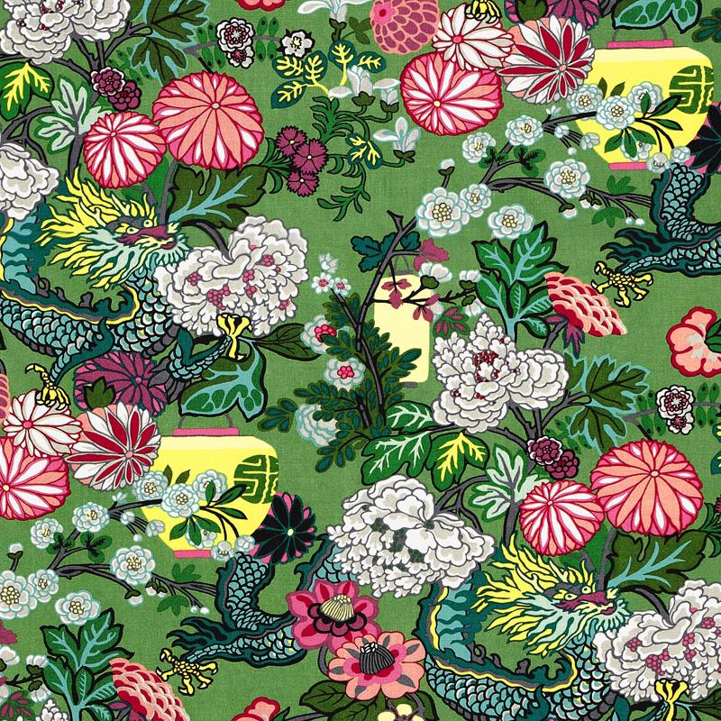 | Chinoiserie inspired by Art Deco print. Floral dragon linen fabric. Half drop match. Also available as a wallpaper. |