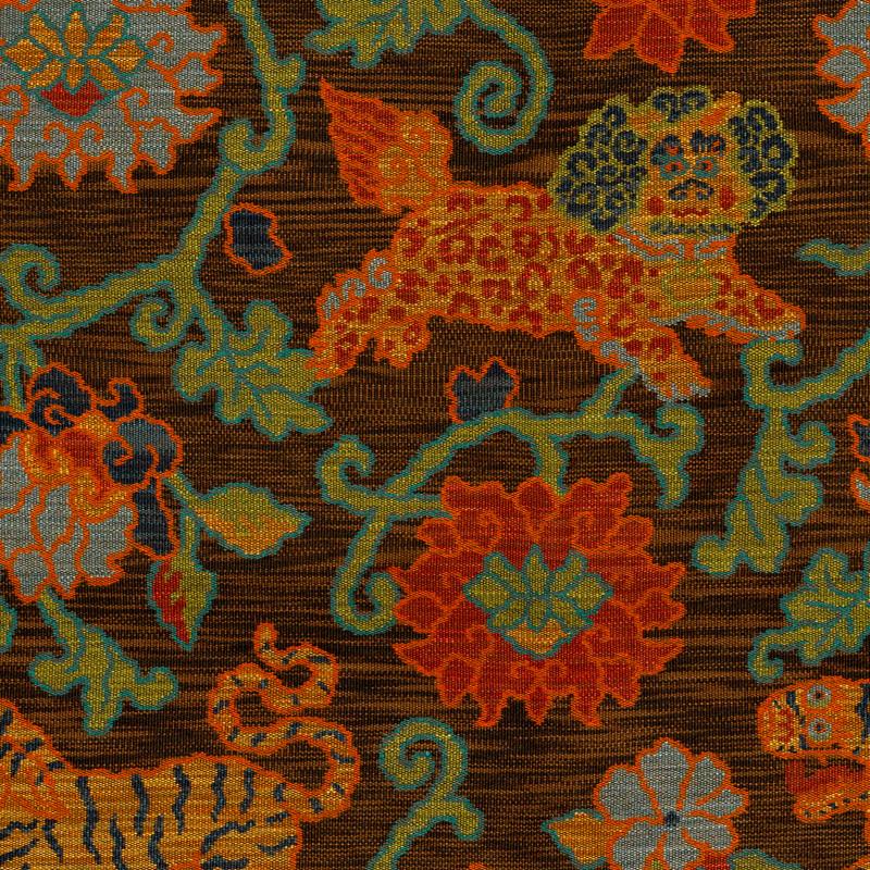| Inspired by antique Tibetan rugs, the luxuriously thick cloth is covered in an enchanting pattern of tigers, snow lions, and lush peonies, and adds a dash of the exotic to a room. |