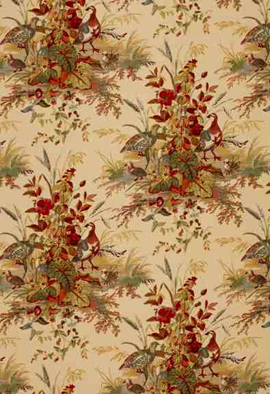 | Classic traditional hunting print features a trio of quail in brush and flowers. |