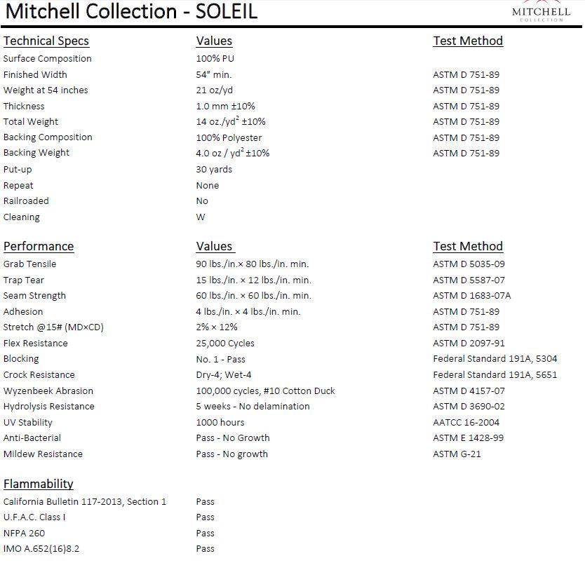 Soleil is a high-performance fabric with a lot to offer. Its polyurethane composition allows it to mimic the appearance of genuine leather while providing exceptional durability. With 300,000 cycles in the Wyzenbeek Abrasion test, it's clearly built to handle heavy use without showing wear. The fact that it exceeds 1,000 hours in the Accelerated Light Aging test without color loss means it will maintain its appearance even in bright or sunny environments. Additionally, its anti-bacterial and mildew-resistant properties make it suitable for various settings where hygiene and resilience are priorities. The broad color palette, ranging from earth tones to vibrant hues, provides flexibility in design, making Soleil a versatile choice for many applications.