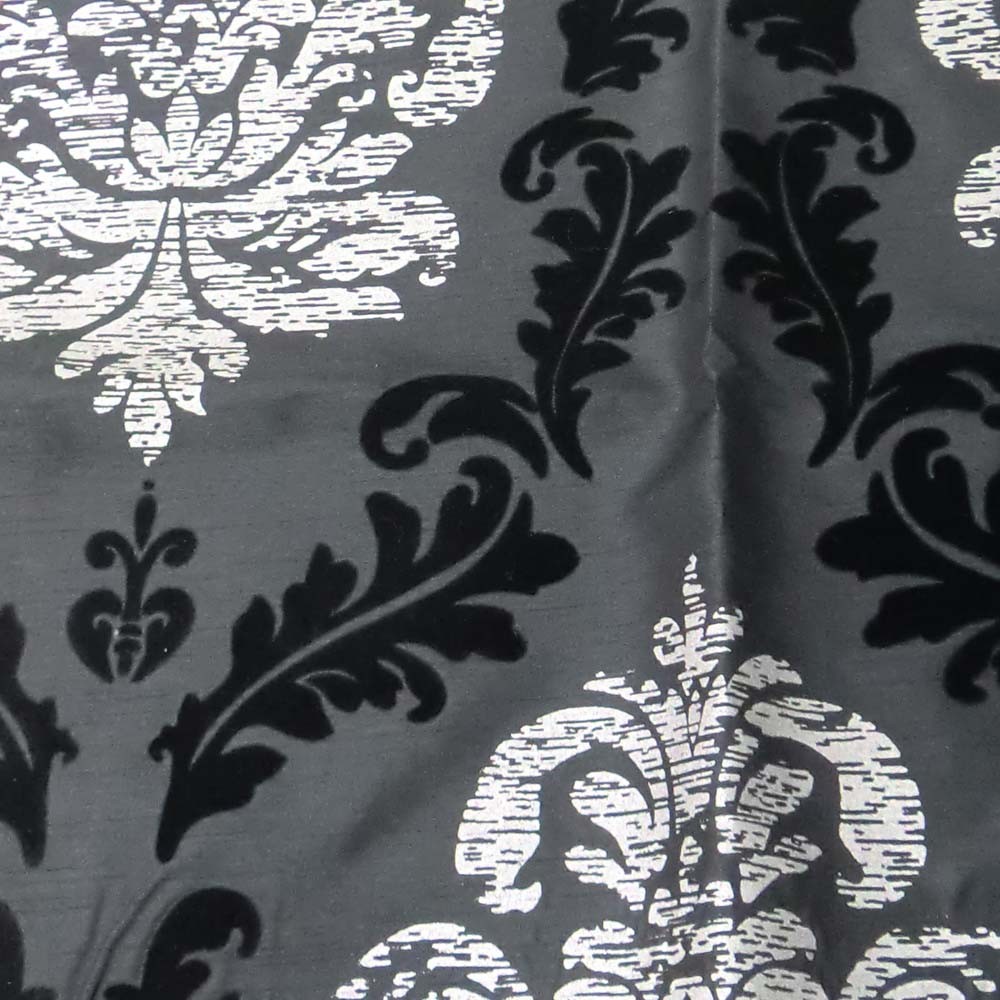 Large damask fabric for draperies, bedding and upholstery. Flocked details surround center design.