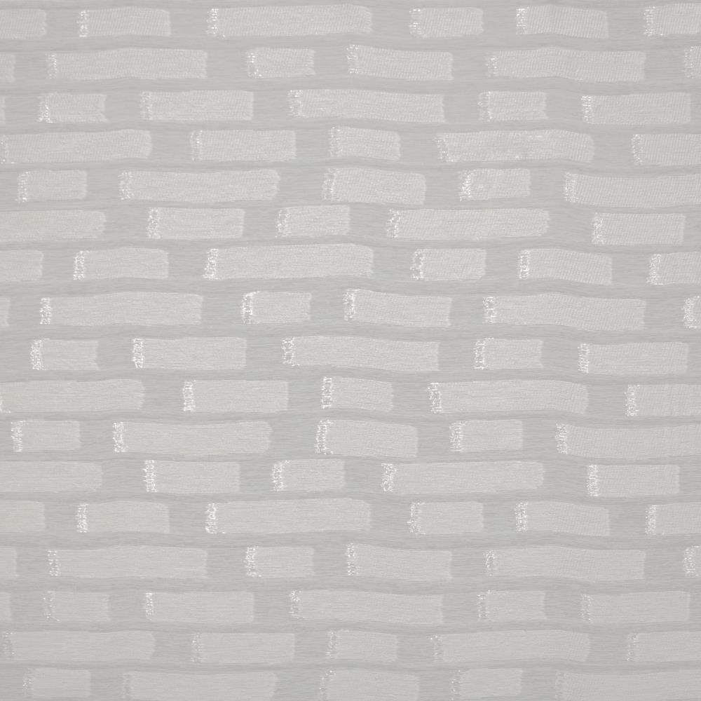 | Sheer - Decorative Mettallic Geometric Fabric Shown on dark background - sheer is white with gray with silver metallic accents. Looks like stacked stone or bricks. Squares Fabric |