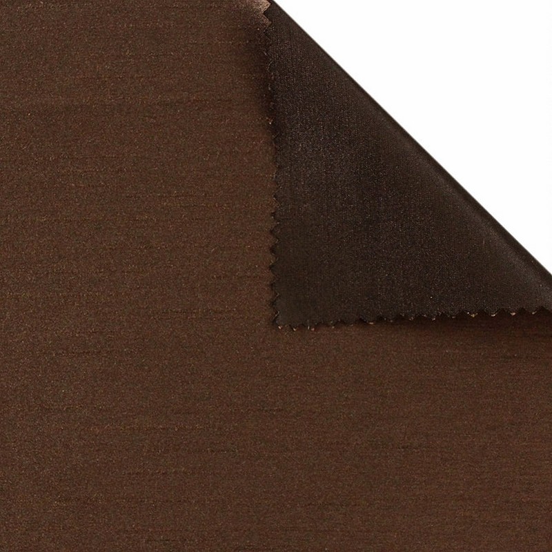 Versatile dark brown satin texture on one side with dupioni/shantung faux silk look on the other, this elegant satin fabric has got you covered. Table linens, special occasion, drapes and curtains, pillows, bedding and clothing.