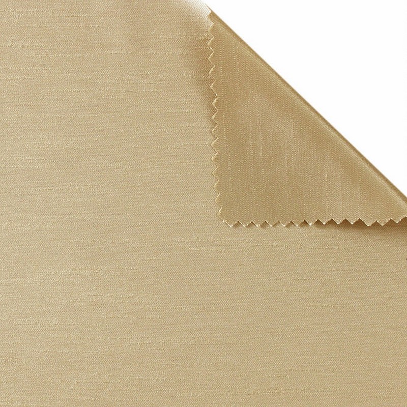 Versatile beige satin texture on one side with dupioni/shantung faux silk look on the other, this elegant satin fabric has got you covered. Table linens, special occasion, drapes and curtains, pillows, bedding and clothing.