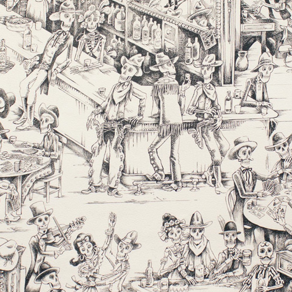 | Your favorite skeleton fabrics having a drink at the local saloon. Alexander Henry Black and White Fabrics People And Character Fabric Skull Fabrics Mexican Fabric Skeletons leaning on bar are approximately 5 1/2" tall. |