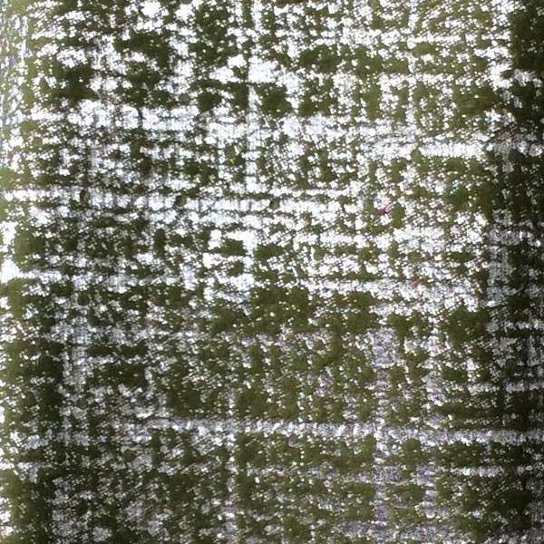 | Soft velvety fabric with a metallic, textured cross-hatch pattern embossed on the durable fabric. Color is the base color with silver metallic embossing. |