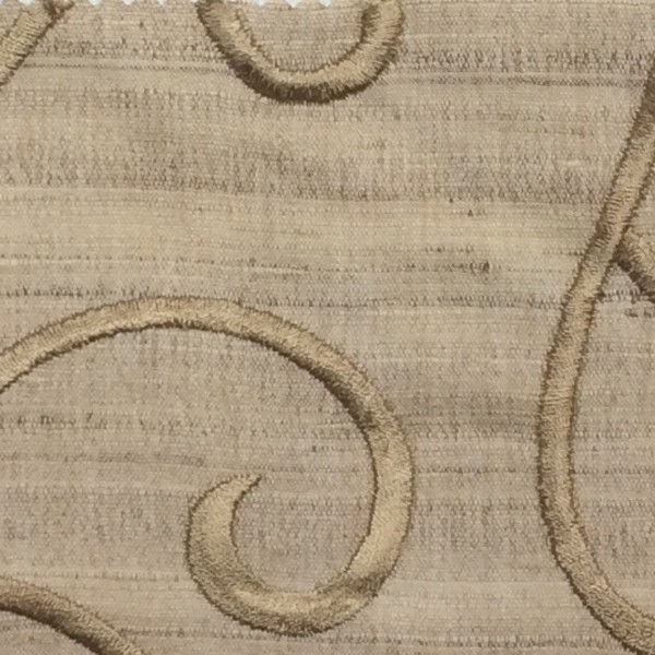 Embroidered silk. Scrolling vine embroidery on solid silk fabric.