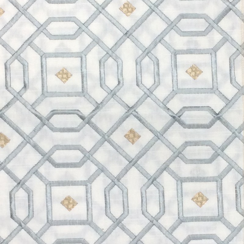 | Linen look fabric with embroidered lattice work. The detailed center square is approixmately 3/4 inch with a diamond pattern. |