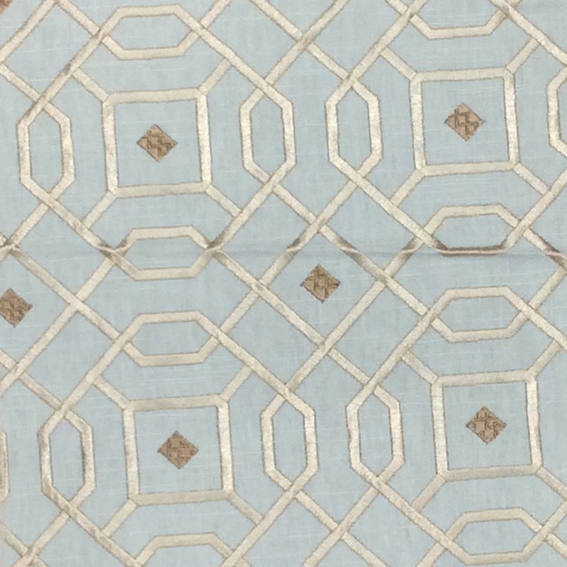 | Linen look fabric with embroidered lattice work. The detailed center square is approixmately 3/4 inch with a diamond pattern. |