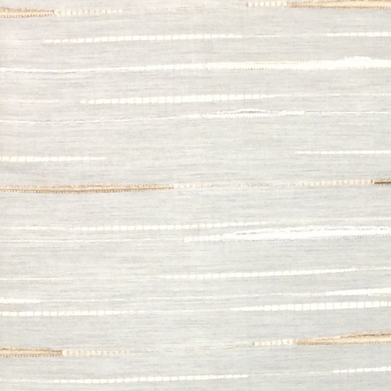 Faux silk drapery fabric with horizontal embroidered stripes have variations including cut yarns for a fuzzy, velvety detail. Silver grey background with beige, light brown and gray stripes.