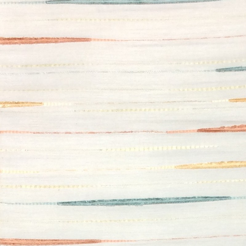 Faux silk drapery fabric with horizontal embroidered stripes have variations including cut yarns for a fuzzy, velvety detail. Creamy background with copper, gold, mint green and yellow stripes.
