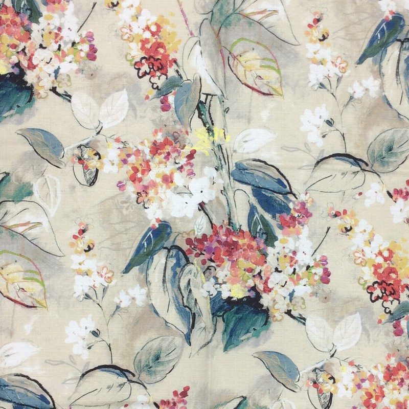 | Modern watercolor floral features a large pattern of leaves and flowers. Add beautiful artistry to your draperies, bedding and home decor accessories. Soil and stain repellent finish. |