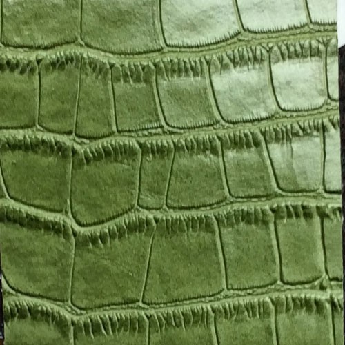 | Green Big Crocodile skin vinyl is shiny with vibrant color, texture and design. Exotic animal skin fabric for upholstery. Automotive, Residential, Conference Room, Recreational Vehicle, and General Upholstery 1 MM Thick Cleaning: Ordinary dirt and stains can be removed with mild soap and water. Rinse with clean water and dry with lint-free cloth. Moderate scrubbing with medium bristle brush will loosen soiling material. |
