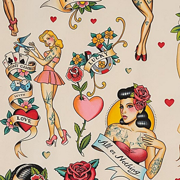 | 24" Repeat - Girl standing next to playing cards is about 8.25" tall Pin Up Fabric |
