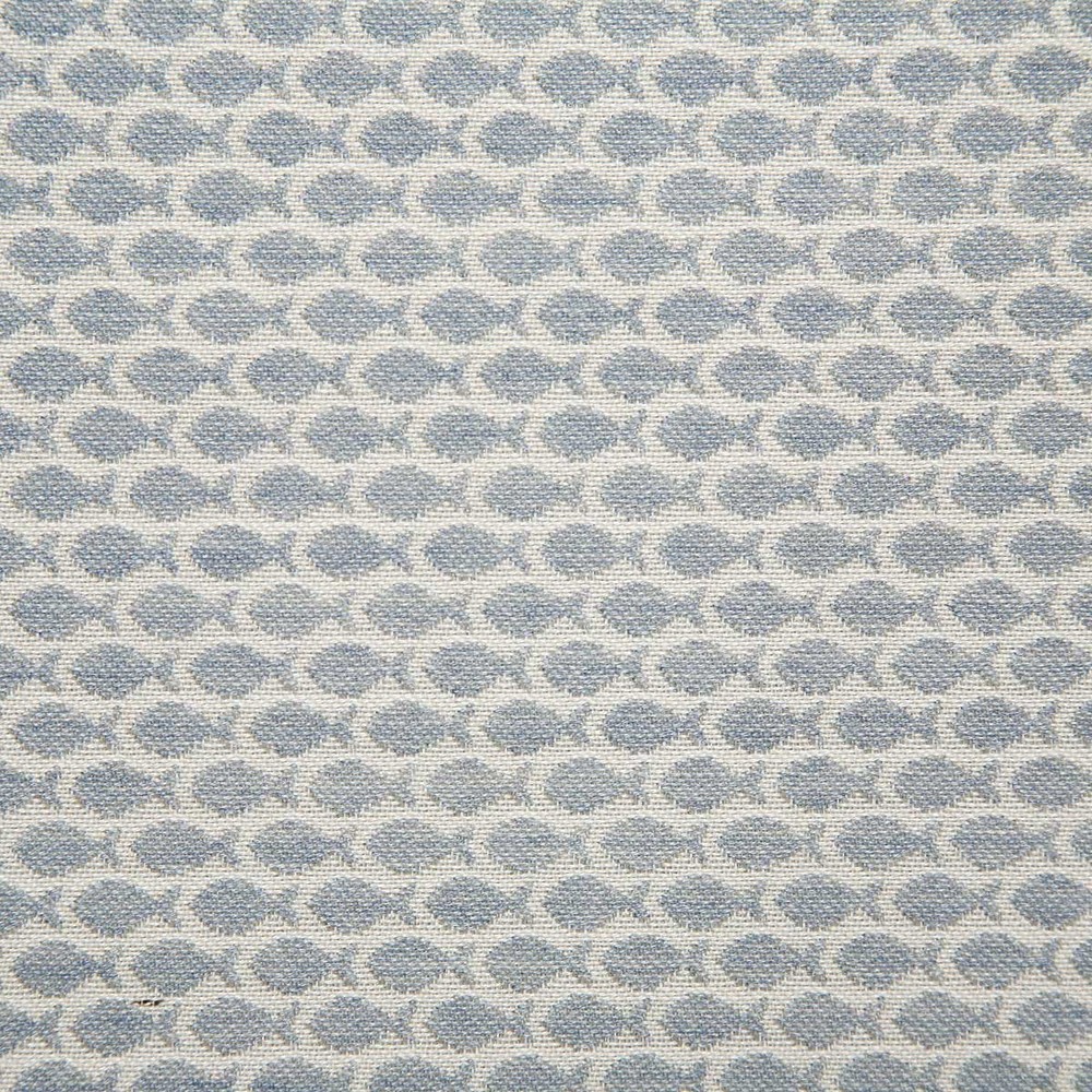 Exclusive pattern. Small scale fish outdoor fabric. Inherently mildew, fade and stain resistant. Upholstery for indoor/outdoor use.