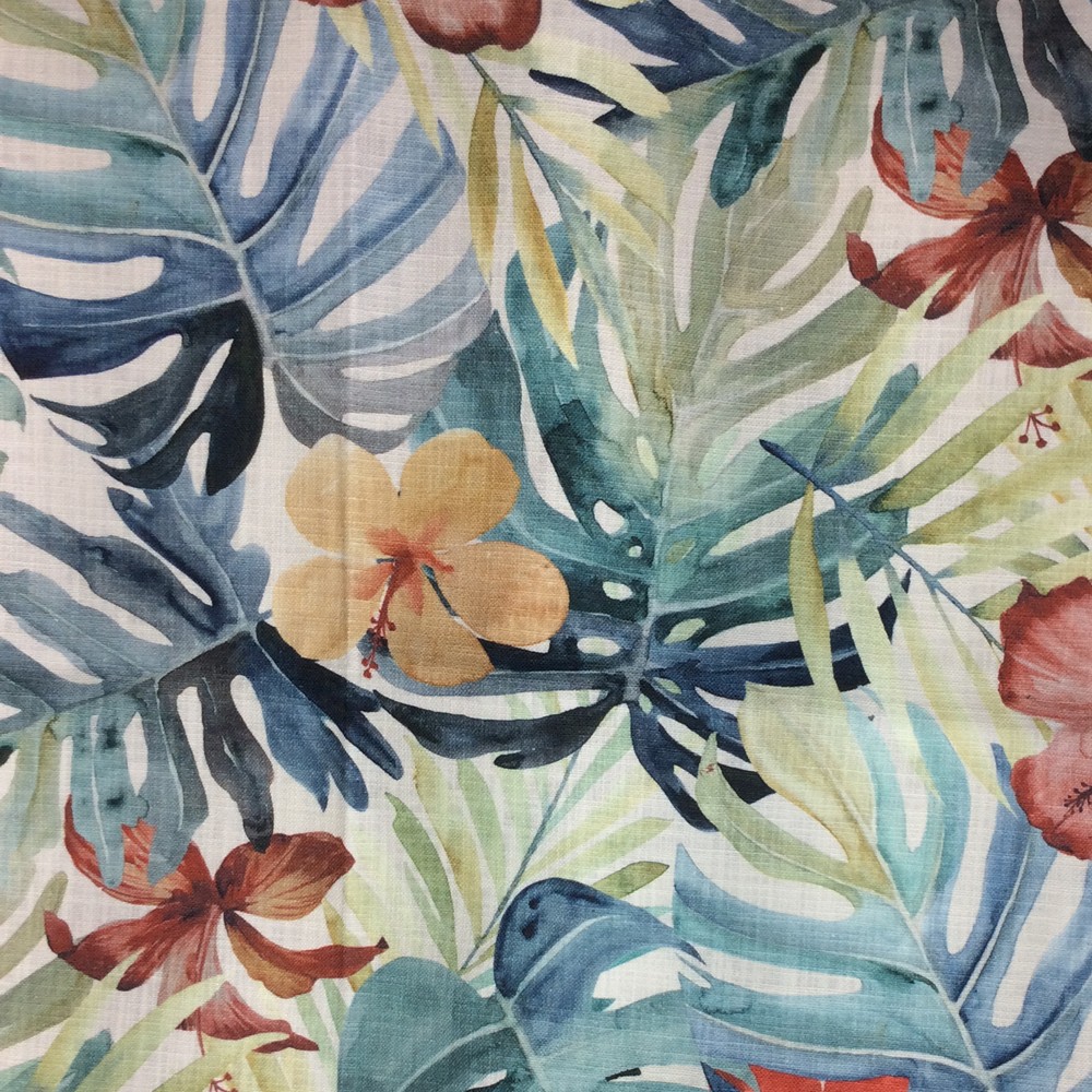Vibrant tropical floral with leaves and hibiscus flowers.