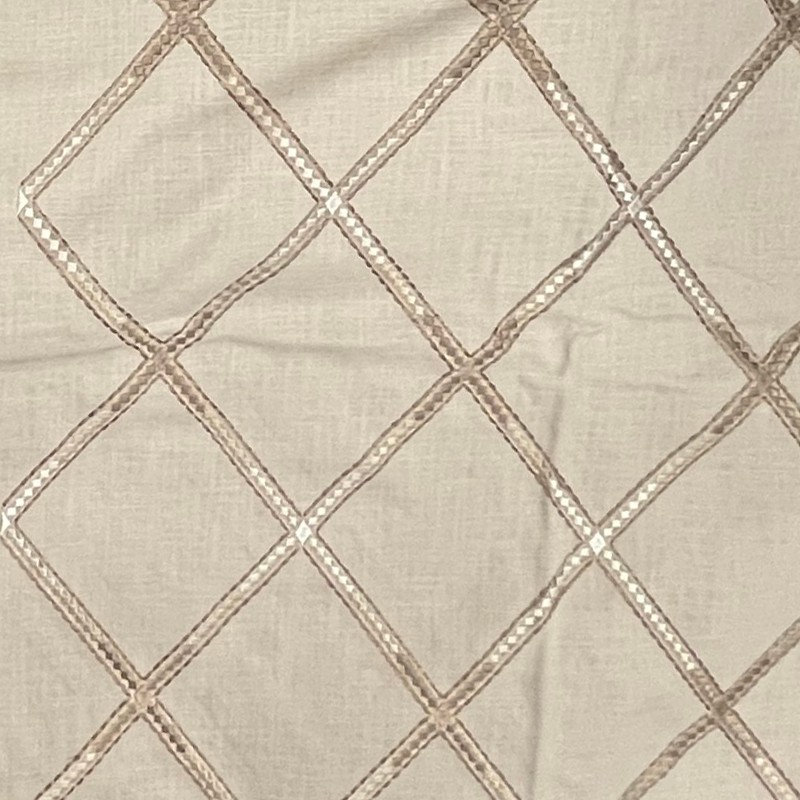 | Large scale embroidered diamond fabric. Diamonds measure about 5.5 x 7 inside the embroidery. Pattern runs up the roll - perfect for drapery panels. The embroidery width is 51 inches. |