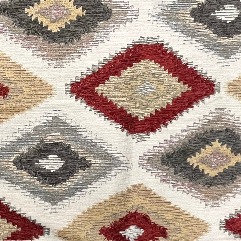 Heavy woven fabric with chenille texture diamonds. This pattern is vibrant and bold with the horizontal diamonds. Pattern runs up the roll.