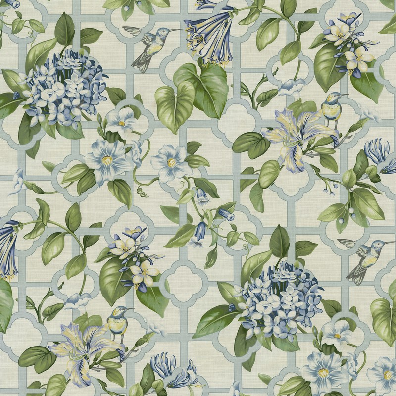Waverly Centennial Cotton Print with beautiful flowers entwined a lattice. Do you spot the playful hummingbird?