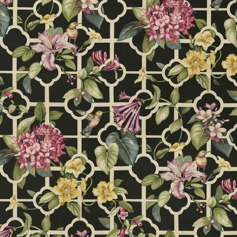 Waverly Centennial Cotton Print with beautiful flowers entwined a lattice. Do you spot the playful hummingbird?