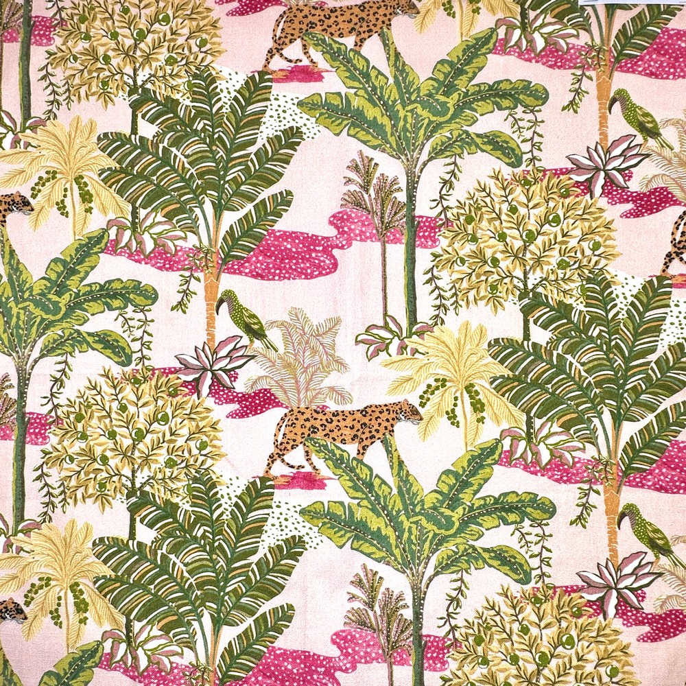 | High-quality cotton print features an oasis with wild animals. |