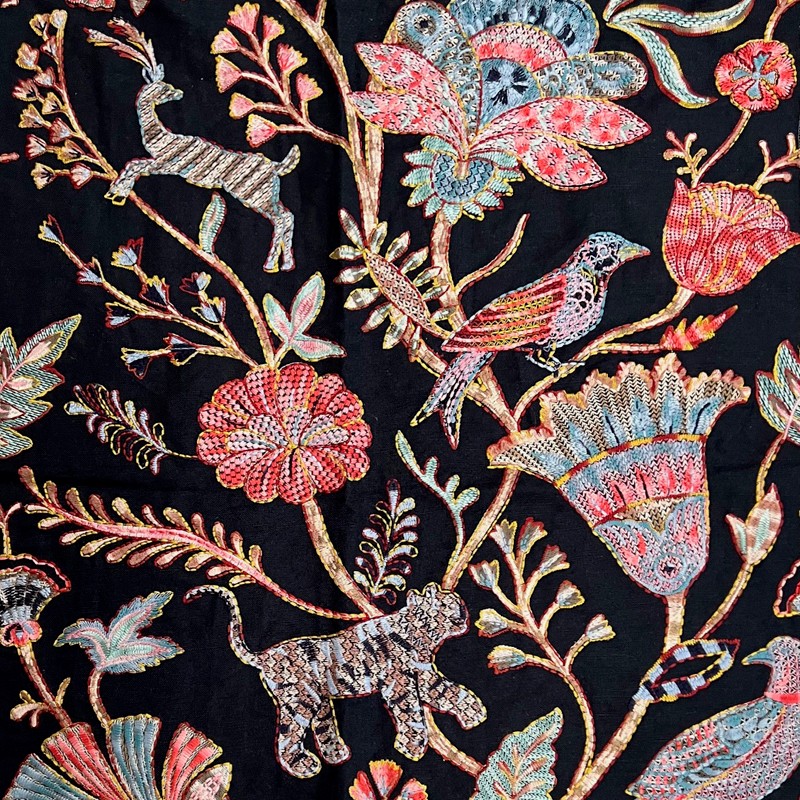 | Large floral with birds and animals. Best-selling linen blend embroidery. This gorgeous fabric will make you stop and smile. |