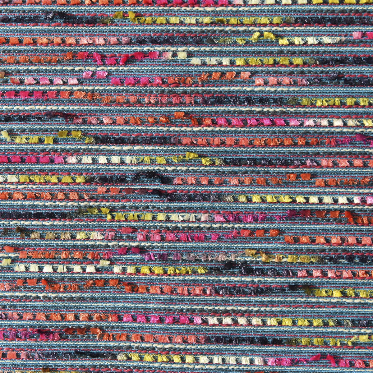 | This fantastic brush design makes a mesmerizing statement. Perfect for custom draperies and stunning table linens. Event Fabrics. Weight: 400 gsm Design: Multicolored fringe bursts from a woven base Blue/grey gound with pinks, yellows, oranges, greens |