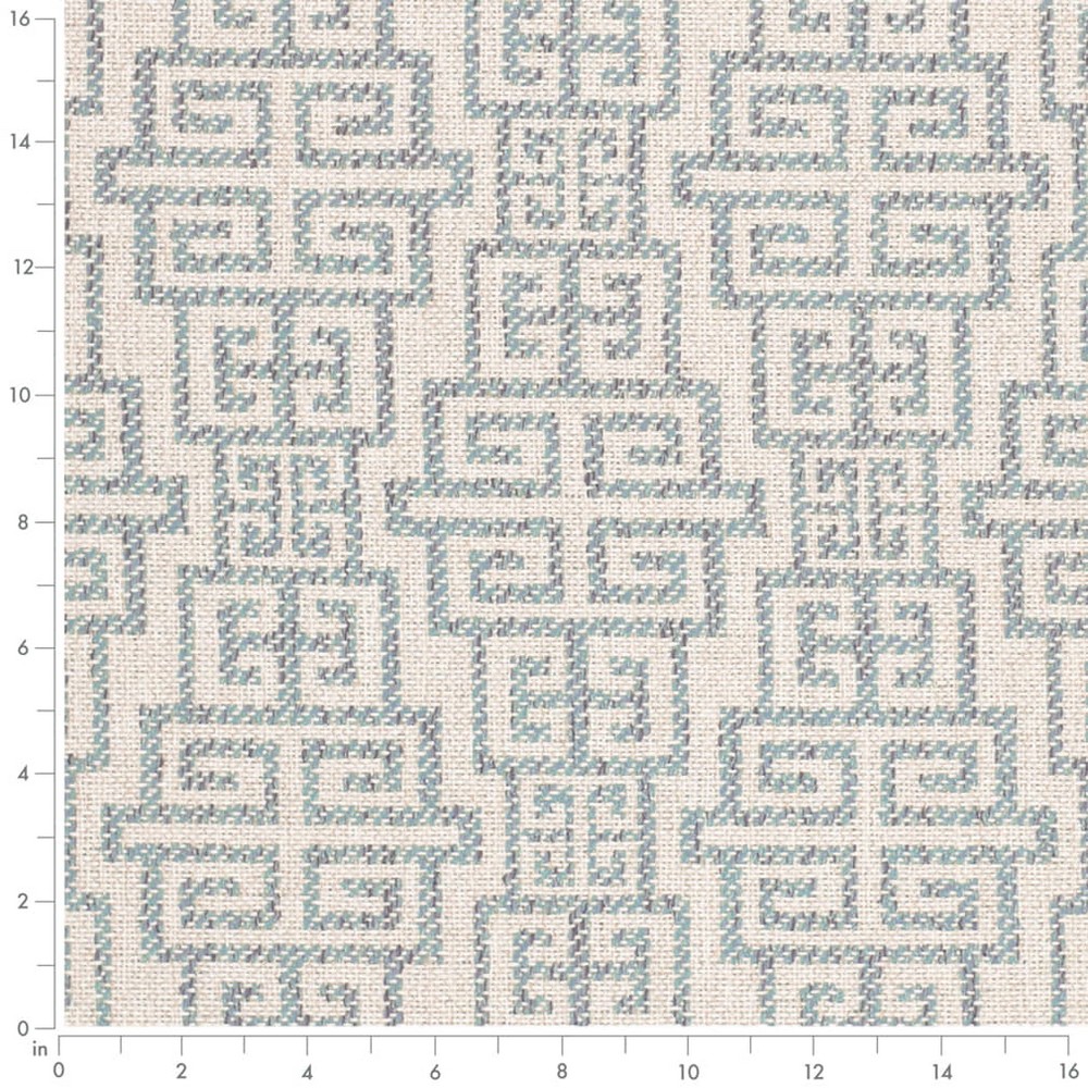 | Charlotte Colors Shades of Seaglass Aqua & Teal Suitable for Upholstery,Contract,Home Abstract & Geometric,Greek Key Woven Patterns Eco Friendly,Fade Resistant,Made In America,Performance Grade,Pet Friendly,Stain Resistant PFAS Free, Low Carbon Footprint, 50 Recycled Water Bottles Per Yard Naturally Inherent Stain Resistance With No Added Treatment, Fade Resistant Shown Railroaded (Across the Roll) |