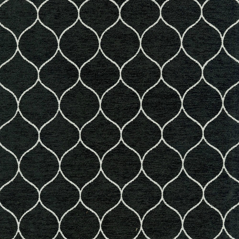 | ABBEYSHEA Black Woven Jacquard Colors: Black -Backing: 100% Acrylic Kiss Coat Upholstery a chair scale chenille with an all over simple ogee outline. This striking black and white coloration will bring a striking feel to any space. |