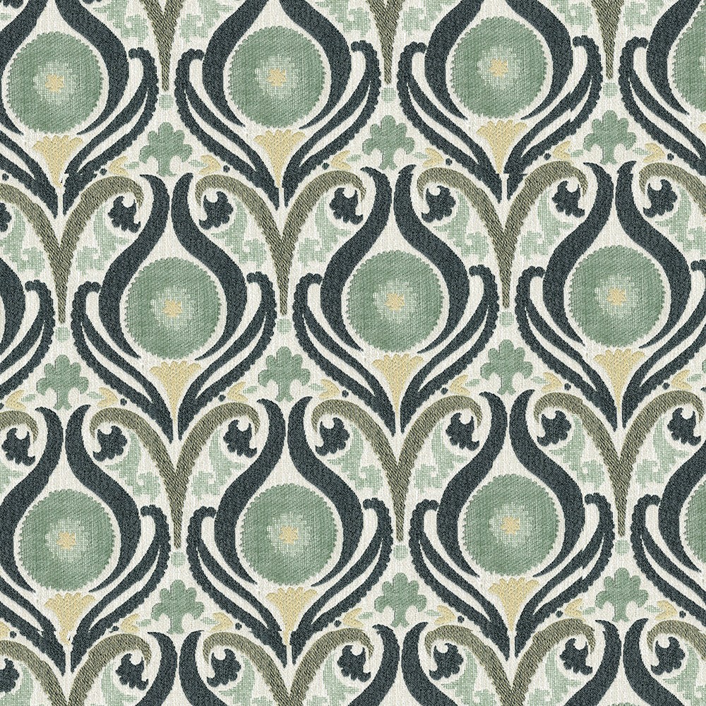 | ABBEYSHEA Blue Woven Jacquard Colors: Blue - Medallion Backing: 100% Acrylic Kiss Coat Colorfastness to Light AATCC 16 - Grade 4.5, hours Upholstery features a tribal suzani motif in our blue color combination. |