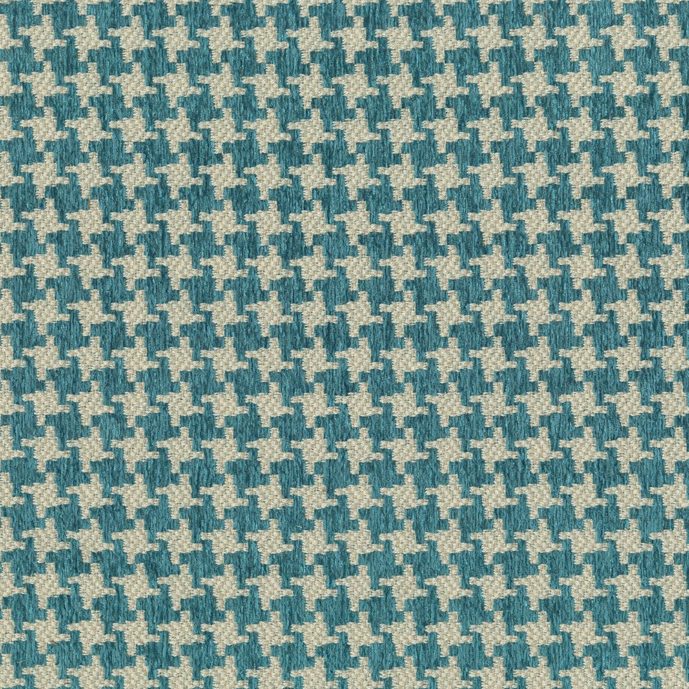 | ABBEYSHEA Blue Woven Jacquard Colors: Blue - Houndstooth Backing: 100% Acrylic Kiss Coat PFAS Free,California Proposition 65 compliant Upholstery a midscale houndstooth shown in blue with detailed weave effects. |