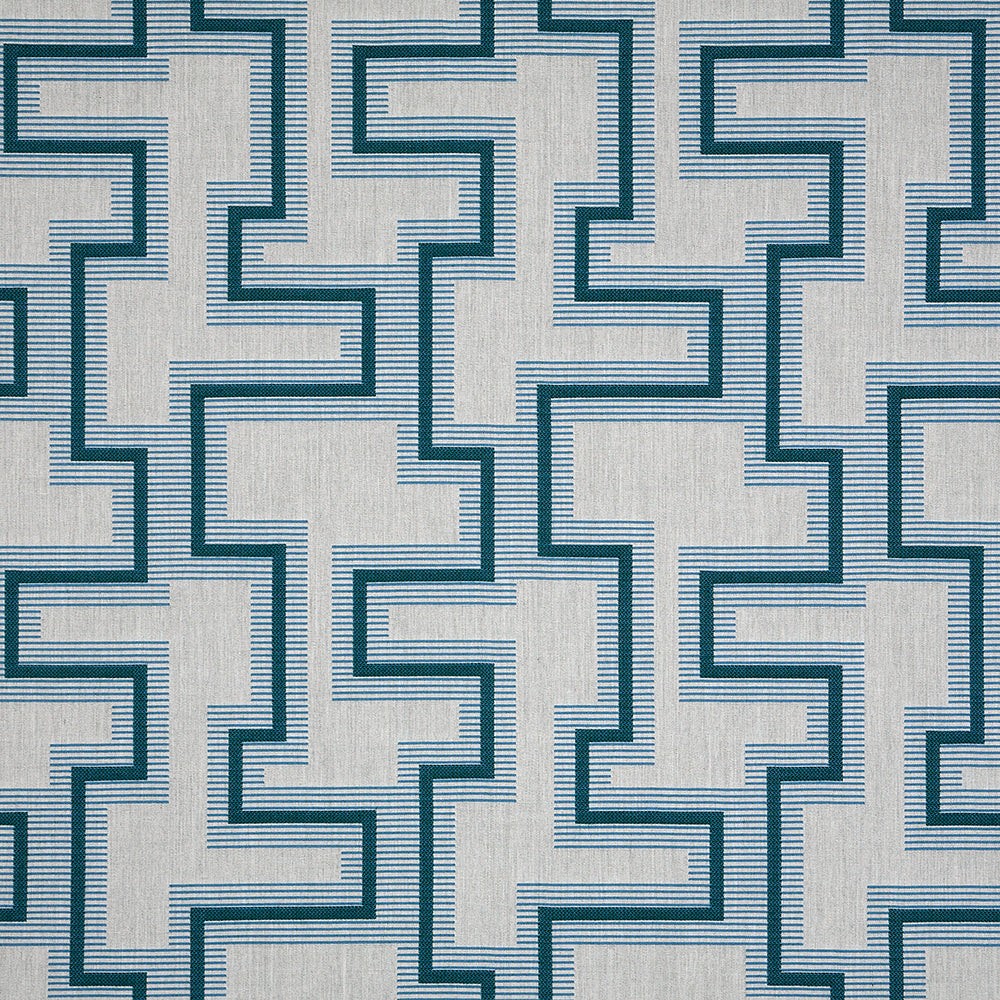 Resonate 14565-0003 Atlantis is a Sunbrella furniture fabric for outdoor and indoor applications. A contemporary interpretation of the classic Greek Key pattern in a gorgeous blue and cream color.
