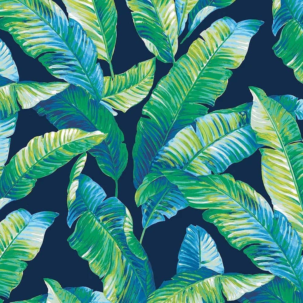 | Large repeats with 10" tropical leaves. Dark navy ground with shades of blues and greens create a lush tropical vibe. Perfect for coastal decor. Features polyester weather resistant material that is easy to maintain and lasts a long time. This easy to clean fabric stands up to weather conditions while providing UV protection levels of 500 plus hours. |