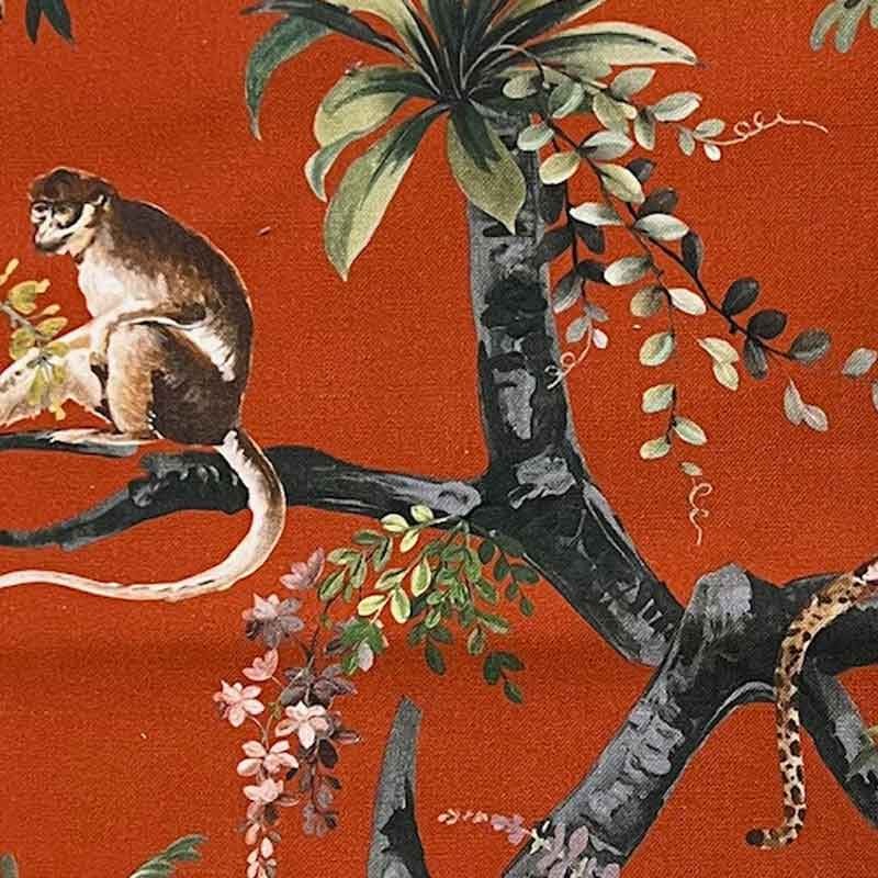 | Tropical trees feature a resting cheetah and a seated monkey. |