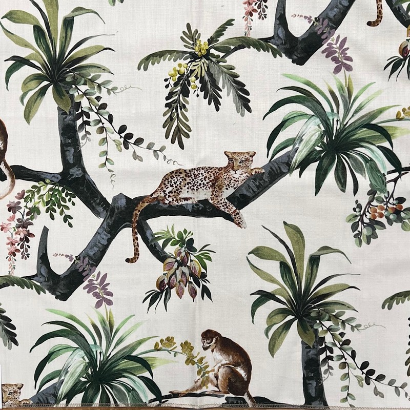 | Tropical trees feature a resting cheetah and a seated monkey. |